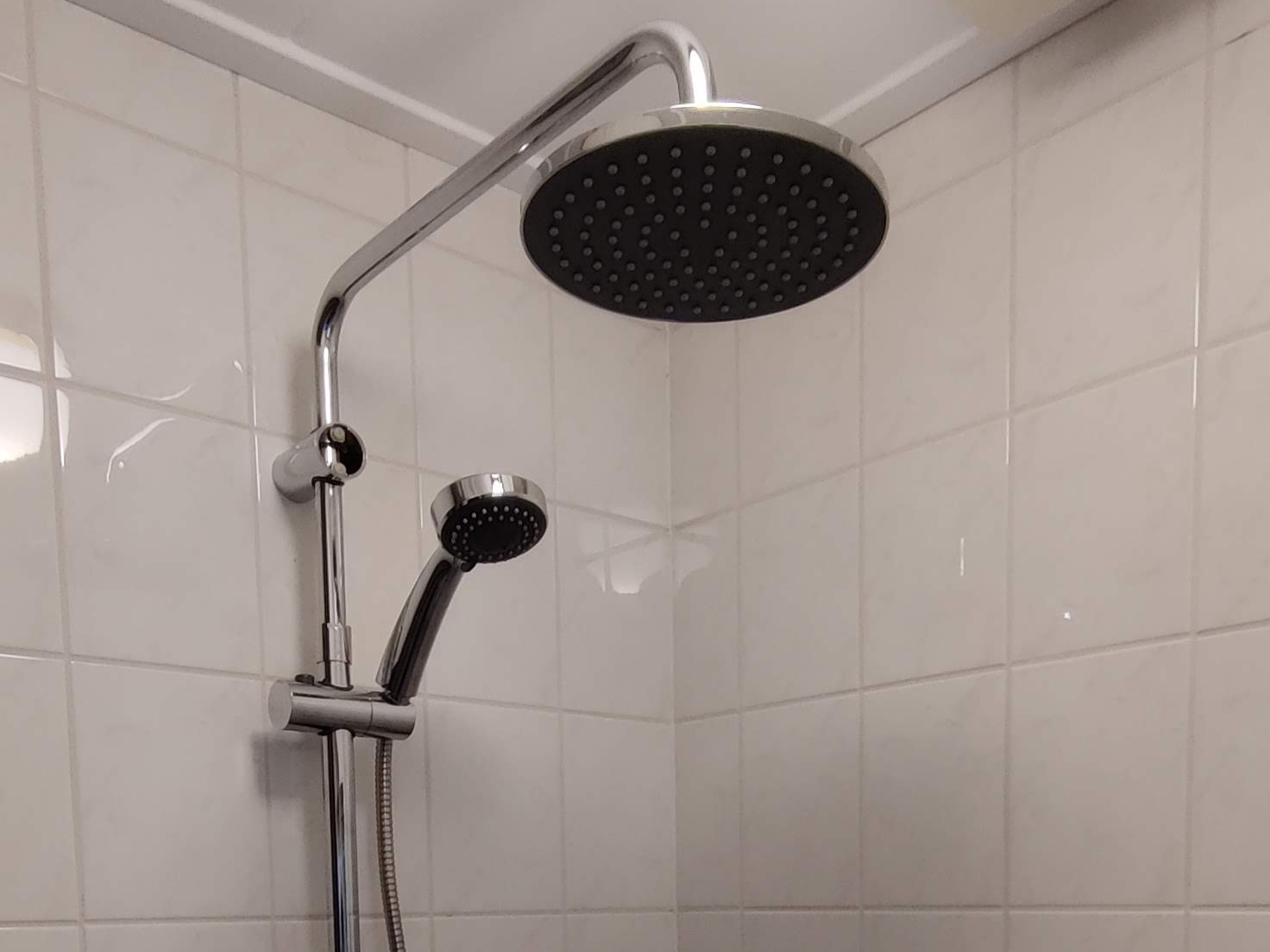 De badkamer is eenvoudig en klein, maar functioneel met een wastafel, toilet en een regendouche met handdouche. In de douche is shampoo beschikbaar. Op de wastafel staat een gevulde zeepdispenser. Er is toiletpapier op voorraad en er zijn handdoeken aanwezig.